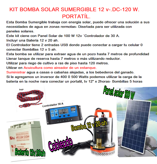 ** BATERÍA SELLADA  DE 20ah X 12V                                                                                                        **MANGUERA 1”                                                                                                                                        **SOGA ATAR BOMBA 8 METROS                                                                                                                       **CABLEADO CONEXIÓN